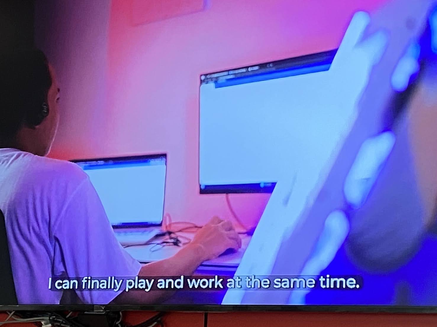 店内の大画面で流れていたのは、27歳フィリピン人男性が、 「家のWi-Fiをグレードアップしてよかった。自宅でコールセンターの仕事をしながら、並行してゲームもできるようになった」 と誇らしげに語る姿(笑)