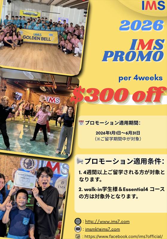 - 4週間で100 USD の割引(25USD/週):セミシングル / 2人部屋 / 3人部屋 / 外部寮2.3人部屋
