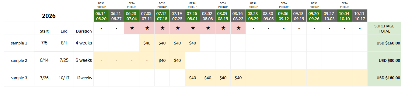 ・適用開始タイミング:2025年11月1日よりお送りいただくお申込みフォーム分から適用対象期間に滞在してる週数に応じてピークシーズンサーチャージが加算されます。適用例とサーチャージ合計額の例 - 2025年10月13日:2026年度BECIカレンダー