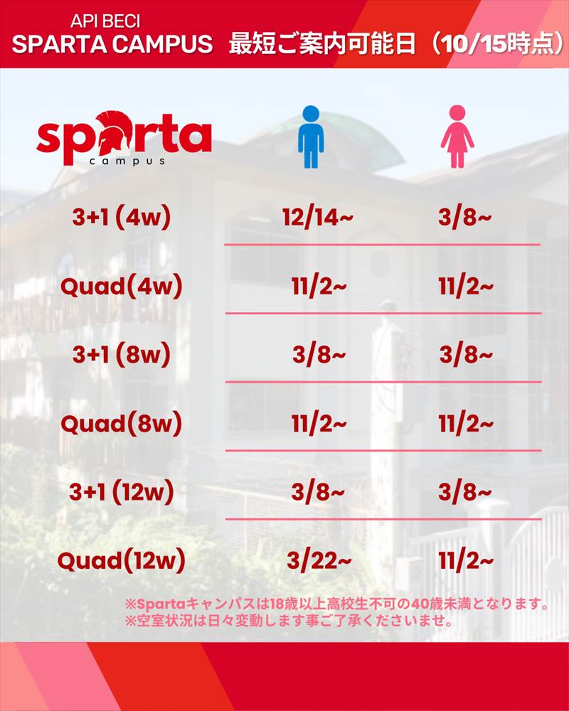 - 2025年10月15日:スパルタキャンパス空き室状況