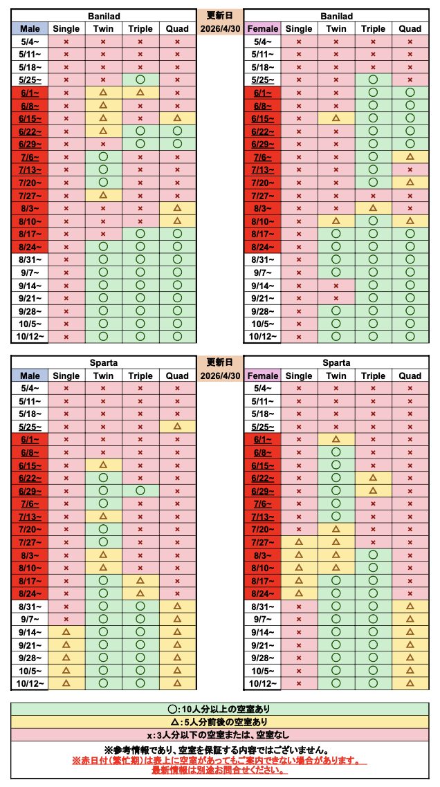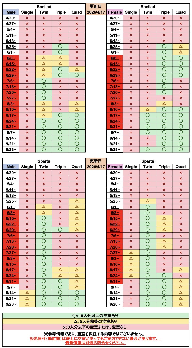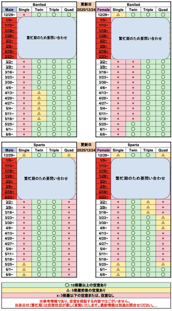繁忙期は空室状況が日々変動いたします。最新情報については別途お問い合わせください。