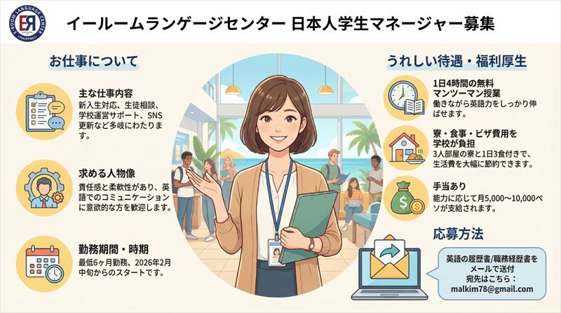 幸い、イールーム・ランゲージセンターの所在するバコロドでは、ほとんど揺れを感じることはございませんでした。ご留学中のすべての日本人生徒様につきましては、ご無事であり、お怪我もないことを確認しております。学校は通常どおり運営しており、バコロド市内におきましても大きな被害は報告されておりません。現時点で確認できている範囲では、平常どおりの状況でございます。 - 2025年10月3日:イールームの案内用スライドを一新