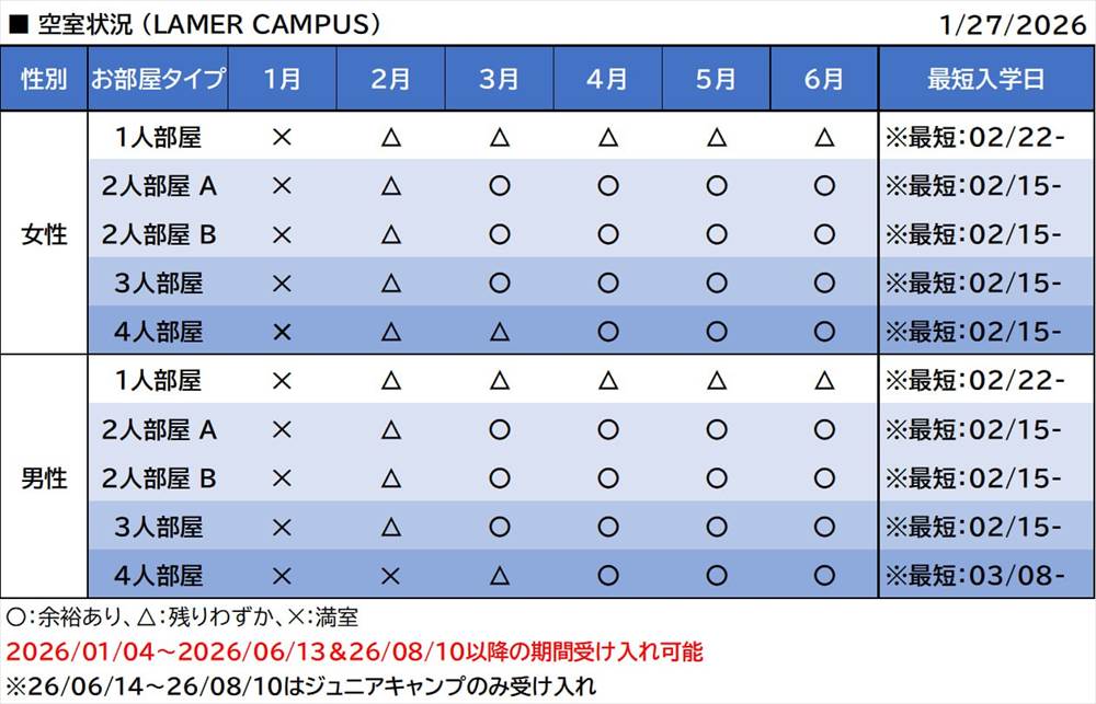 但し、2026年6月14日〜8月9日はジュニアキャンププログラムのみ受け入れとなります。