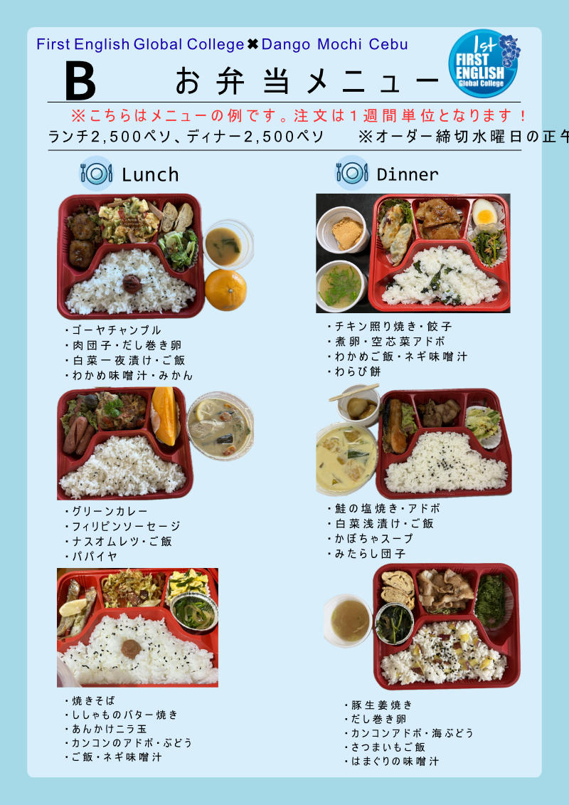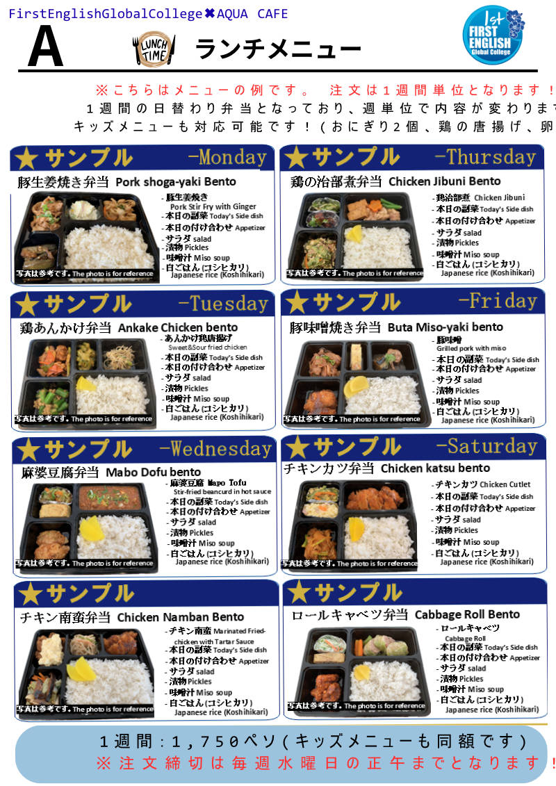 現在は、学校近くの「四季彩」さんのお弁当を提供しておりますが、新たな選択肢として、肉・魚・野菜を選べ、フィリピン料理・日本食・各国料理を組み合わせたお弁当のプレスタートを予定しております。