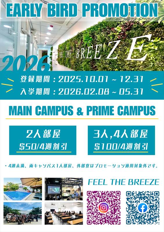 昨晩セブにて地震が発生いたしましたが、当校の学生・職員に被害はなく、現状建物や施設にも影響は見られておりません。皆様にはご心配をおかけすることのないよう、取り急ぎご報告申し上げます。引き続き、安全面には十分配慮しながら学校運営を行ってまいります。 - 2025年10月1日:プロモーションのご案内