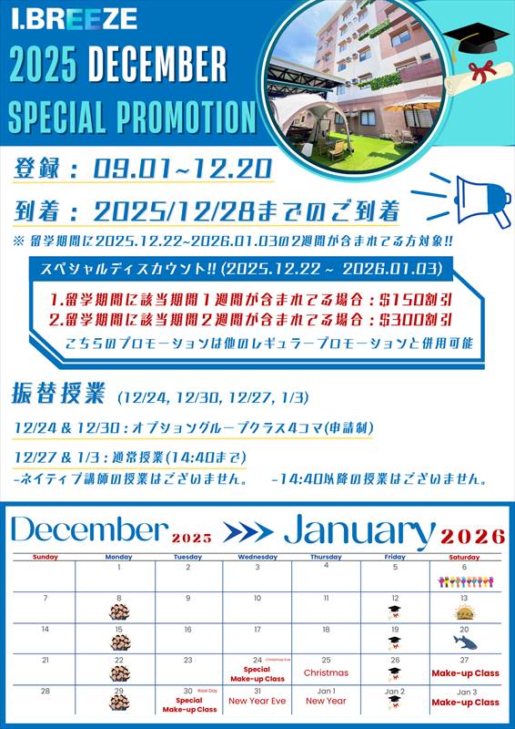 - 12/22~1/3の2週間全てが留学期間に含まれる方:$300割引
