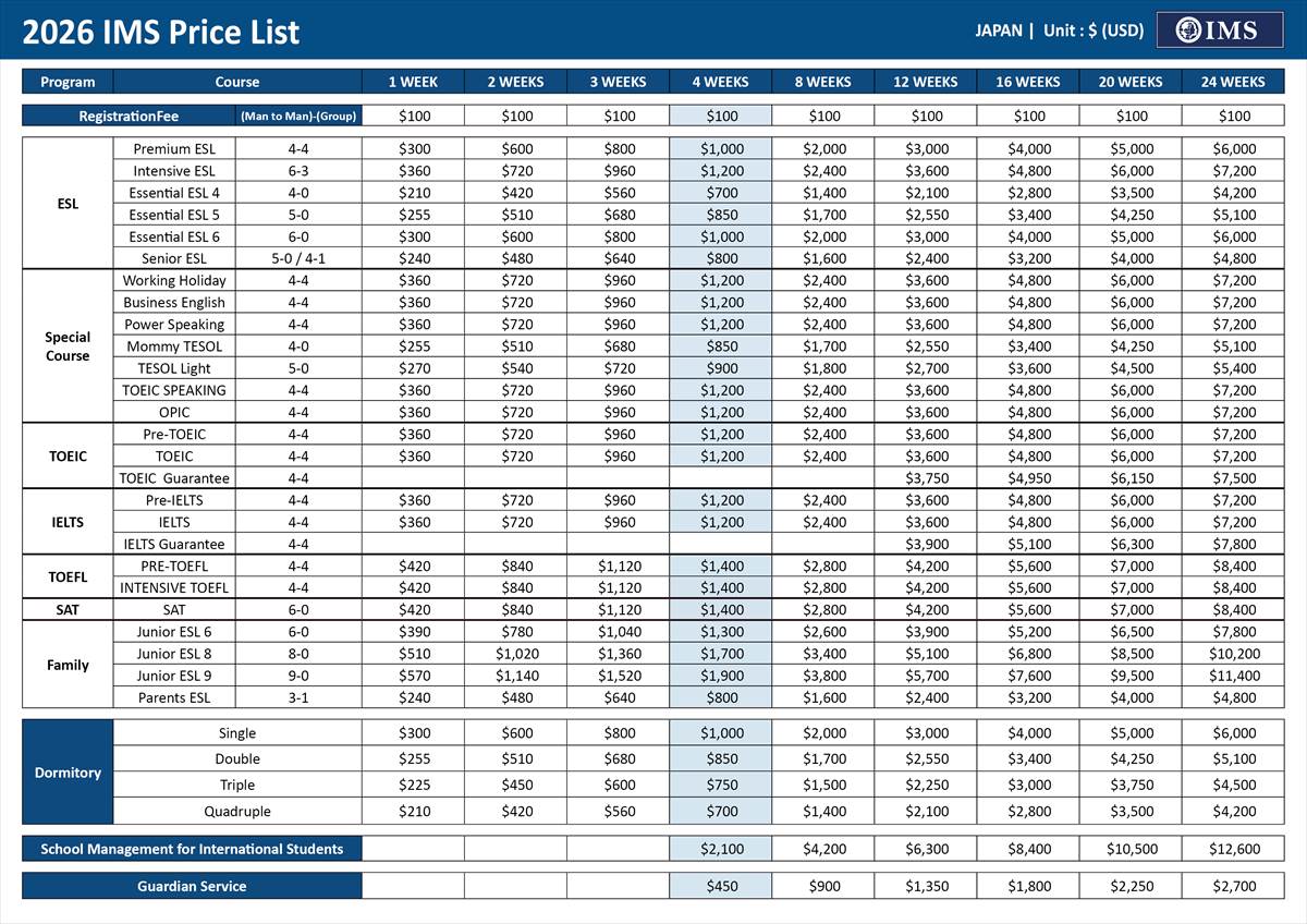 ・プロモーション内容:4週間以上ご受講いただく場合は、プロモーション(4週間あたり$300のディスカウント)が適用されます。