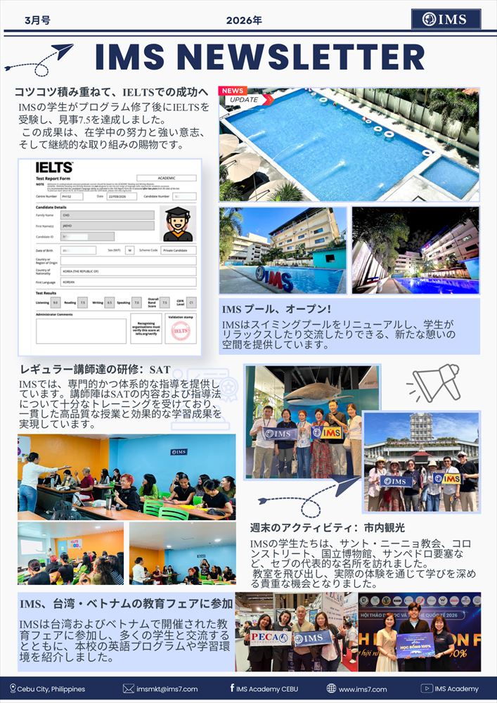 IMS Academyは、フィリピン・セブにある、公式試験対策と実践的な英語力育成の両立を重視した語学学校です。IELTS・TOEIC・TOEFLなどの試験対策から、日常英会話、ビジネス英語、ジュニア・ファミリー向けプログラムまで、目的や年齢に応じた多様なコースを提供しています。