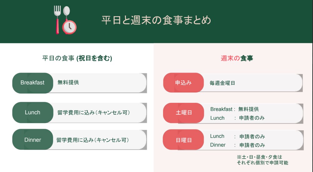 寮(部屋)タイプ | 1人部屋、2人部屋、4人部屋、6人部屋、3人部屋(親子留学用) |
