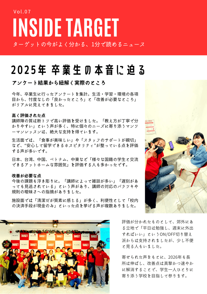 「1分で分かる学校の今」をコンセプトに発刊しているニュースレター INSIDE TARGETをお届けいたします。2026年の第一回目は、1分では語り尽くせない「教育人材」がテーマ。いつもと異なる8ページものボリュームで、TARGETの教育品質を支える人たちにフォーカス。講師の質、日本人アカデミック職員の存在意義、そして教育への熱意を詳しく解説しています。News Letter 別刊 - 2025年12月25日:News Letter vol.07